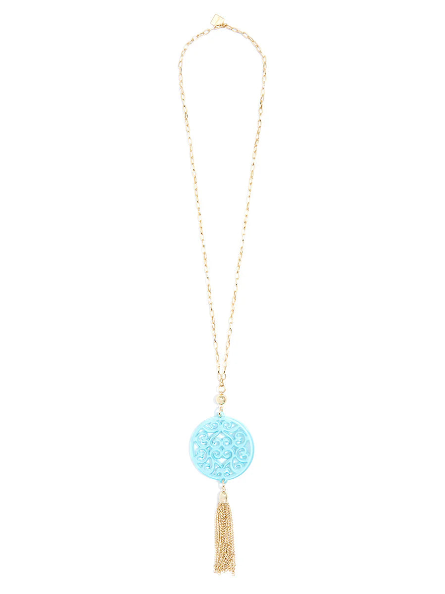 Long shiny metal chain necklace with a resin pendant in Swirled Circle design and metal tassel drop.